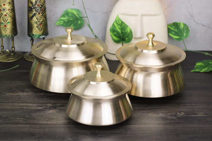 Handmade kitchenware in bronze, brass, and copper blends durability with elegance. These materials offer strength, antibacterial properties, and excellent heat conductivity, making them both functional and decorative for any kitchen